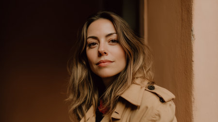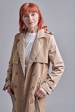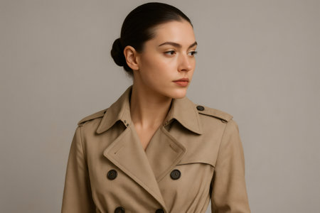 Stylish businesswoman wearing a beige trench coat, posing in a studio setting with a neutral background, looking thoughtfully to the side