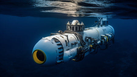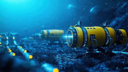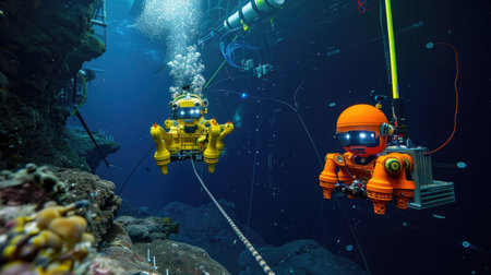 Two underwater exploration robots are navigating the deep ocean environment, capturing stunning imagery of marine life and ecosystems with advanced technology.