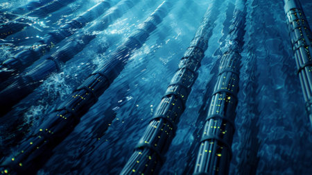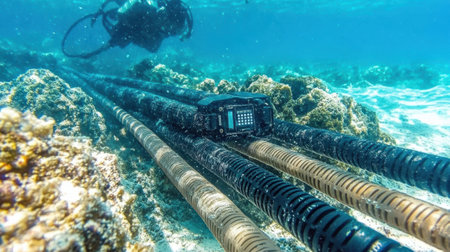 In crystal-clear waters, a diver investigates the intricate network of underwater internet cables spanning the ocean floor, linking distant lands with unseen technology.
