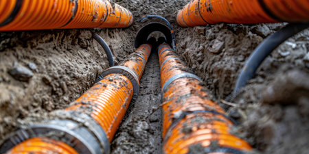Orange pipes laid side-by-side in a freshly dug dirt trench