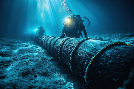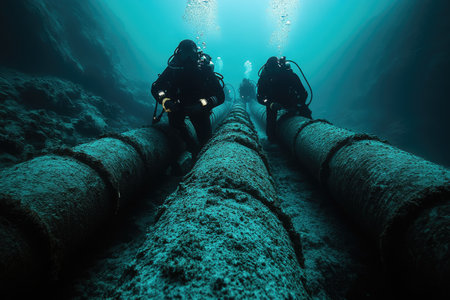 Scuba divers inspecting large underwater pipelines in deep ocean waters