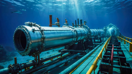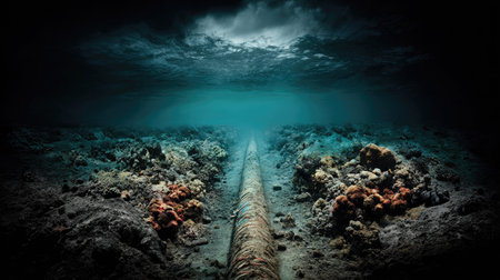 Underwater pipeline for oil and gas transport, subsea industry equipment at sea bottom, metal conduit in blue ocean, petroleum production and energy supply technology.