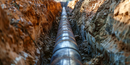 Perspective view showing a long metal pipe running through a narrow, excavated trench, with reddish-brown soil on either side, showcasing underground infrastructure construction.