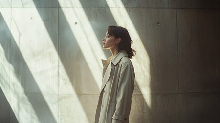 Person in stylish trench coat stands amidst tall geometric architecture in soft light