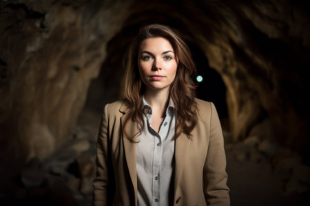 A young woman wearing a brown coat standing in front of a stone wall with shadows on her face AIG51A.
