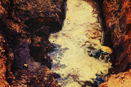 Leak from a broken water pipe in a trench near a construction site causing disruption and potential damage