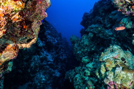 Underwater Coral and Cable Scene. A vibrant underwater view of coral reefs with marine life surrounding a large, weathered underwater cable.