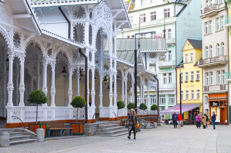 Karlovy Vary, Czech Republic, May 10, 2019: The Market Colonnade Trzni kolonada wooden colonnade with hot springs and people are walking in town Carlsbad historical city centre, West Bohemia