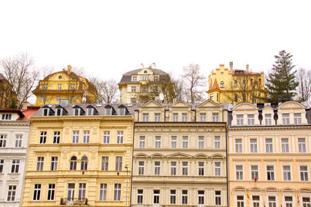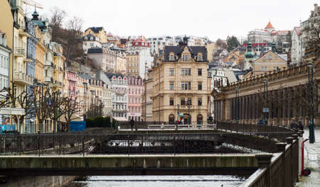 Karlovy Vary, Czech Republic - January 25, 2015: a row of hoytels and shops in the spa town of Karlovy Vary (Carlsbad), Czech Republic, photographed on January 25th, 2015.