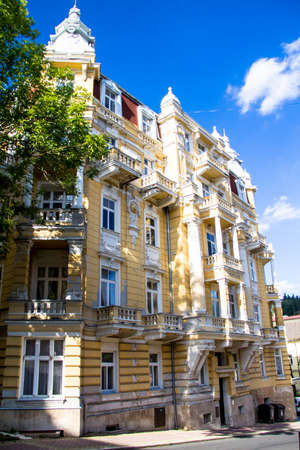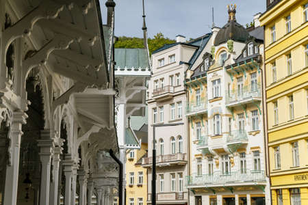 Karlovy Vary, Czech Republic - August 26, 2016: European colorful buildings and street in sunny day