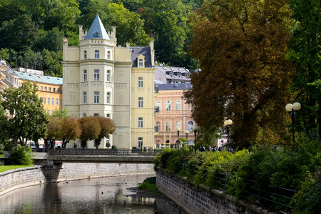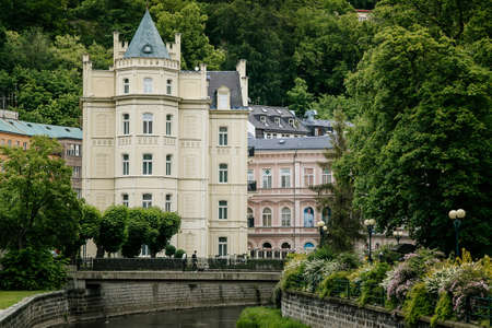 Karlovy Vary, Czechia - September 11, 2017: A building on the Tepla River. The footbridge for pedestrians over the river can be seen from afar and there are many trees around it