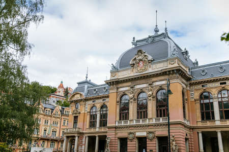 CZECH REPUBLIC, KARLOVY VARY, ROUNDABOUT CONNECTION HOROVA, BEZRUCOVA AND VITEZNA - OCTOBER 03, 2018: Beautiful apartment building with ornaments in the city center of Karlovy Vary