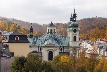 Cityscape with Saint Mary Magdalene church (Karlovy Vary). Famous Czech Spa Karlovy Vary (Karlsbad) in the late autumn time.