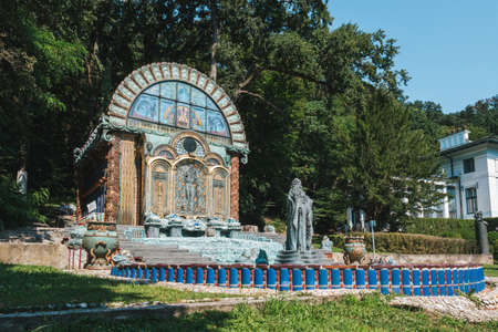 Vienna, Austria - August 8 2020: Fountain House Nymphaeum Omega in the Park of the Ernst Fuchs Museum, at the Otto Wagner Villa in the Hütteldor Suburb in Vienna.
