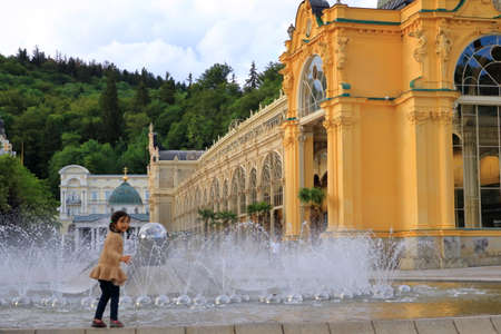 Marianske Lazne, Czech Republic - May 30 2021: View of the spurting water fountain. Yellow colonnade building in the background. Sunny spring day in a spa city.