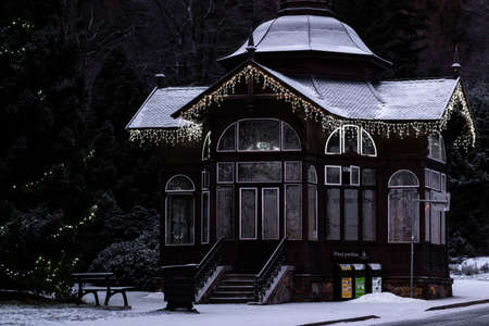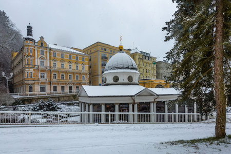 Marianske Lazne, Czech Republic - December 29 2020: Winter scenery of the Cross Spring Pavilion in spa city in western Bohemia covered with white snow. Yellow buildings in the background.