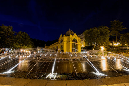 Main colonnade and singing fountain at night - center of Marianske Lazne (Marienbad) - great famous Bohemian spa town in the western part of the Czech Republic (Karlovy Vary region)