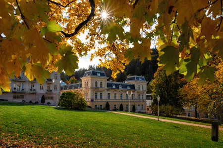 Marianske Lazne, Czech Republic - October 17, 2022: Autumn atmosphere in Czech spa Marianske Lazne (Marienbad) - building of the hotel Ensana Maria Spa Health Spa Hotel