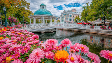 An inviting image showcases a charming gazebo and bridge, surrounded by vibrant floral arrangements. The scene features a tranquil waterway, complemented by nearby architectural structures. This composition employs bright colors, emphasizing natural light and a balanced perspective. It is suitable for diverse applications like advertising, editorial content, and website design, evoking a sense of peace.