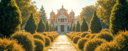 Golden sunlight bathes the majestic building at sunrise, highlighting its intricate architecture amidst lush, carefully trimmed hedges and trees, creating a serene garden atmosphere.