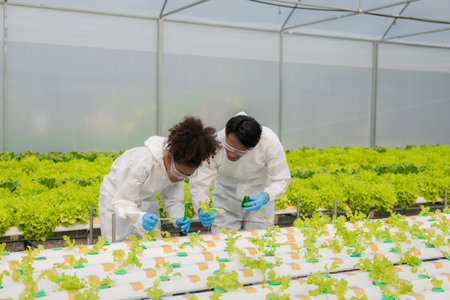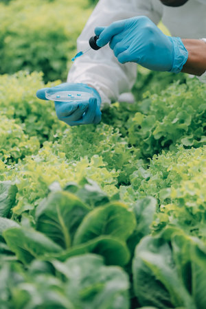 African American researcher and plant genetics expert. Test the quality and bacteria in the hydroponics vegetable garden. Researchers are collecting samples to test vegetables grow