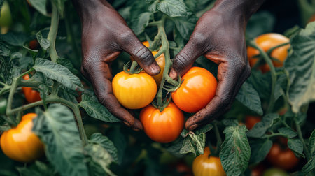 Hand gently holds three ripe golden tomatoes surrounded by vibrant green leaves, reflecting the care taken in nurturing this summer harvest.