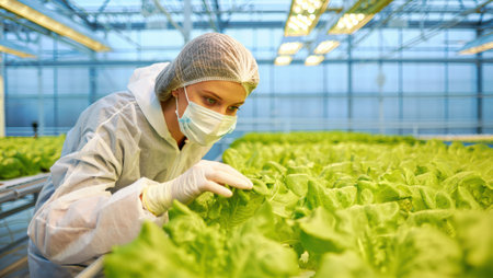 A researcher in protective gear examines healthy green lettuce plants in a well-lit greenhouse. The focus is on maintaining quality and safety in food production