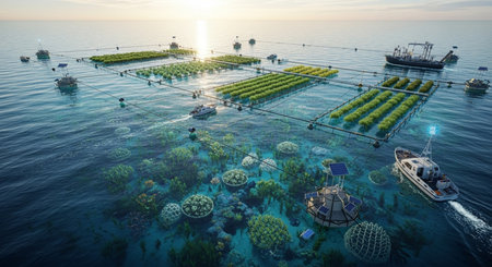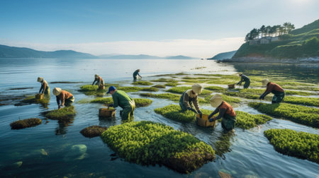 Sustainable seaweed farming practices with a photo of farmers tending to seaweed crops in an eco-friendly ocean garden.
