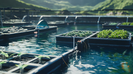 Expansive aerial view of a futuristic offshore aquaculture project. Floating hydroponic farms cultivate crops on the surface, while beneath, a vibrant underwater garden flourishes with marine life and coral restoration efforts, supported by solar-powered buoys and research vessels.