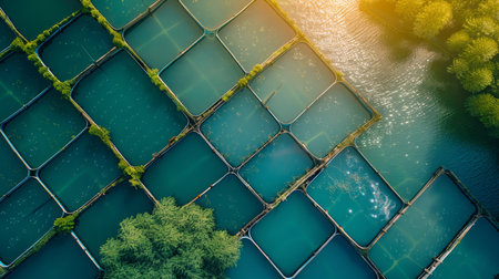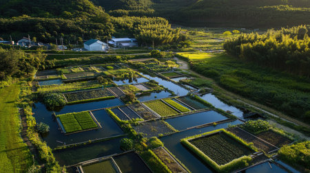 Aerial View of Aquaculture Ponds Surrounded by Lush Greenery at Sunset Showcasing Sustainable Fish Farming Practices. Generative AI