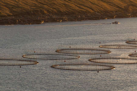 Top view at the round ponds encircled with net of fish farm in Adriatic sea, Kotor bay. Montenegro