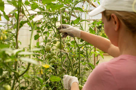 Young caucasian woman in a greenhouse with tomatoes controls plant growth.
