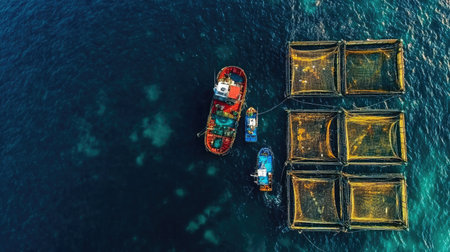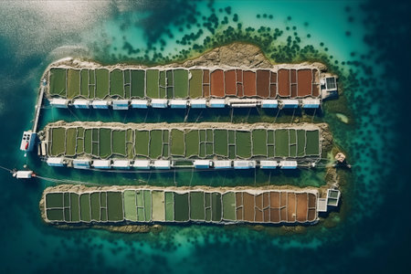 Fishing on the seashore, a view of a fish farm from a drone, reproduction of fish on feprms, generative AI.