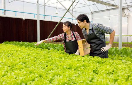 Hydroponics, smiling young Asian couple farmers harvest organic vegetable salad from farm garden, nursery. Organic farming business concept.