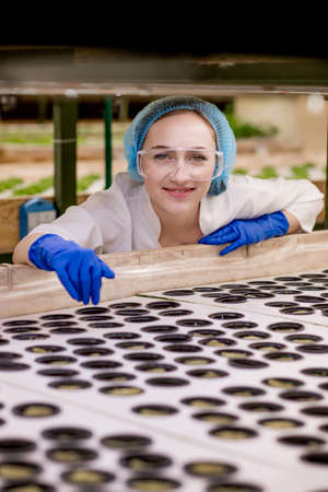 Woman gardeners keep greenery at hydroponic farm and observing growth greenery meticulously before delivered to the customer. Hydroponic greenery growing in hydroponics farm.