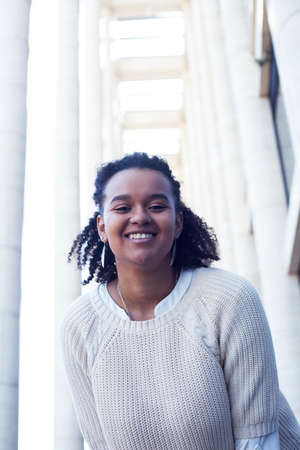 Portrait of a latin woman with curly hair looking straight distracted outdoors