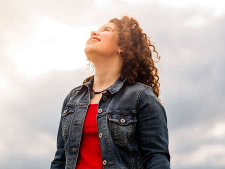 Portrait of a happy young woman in denim jacket against the background of the sky