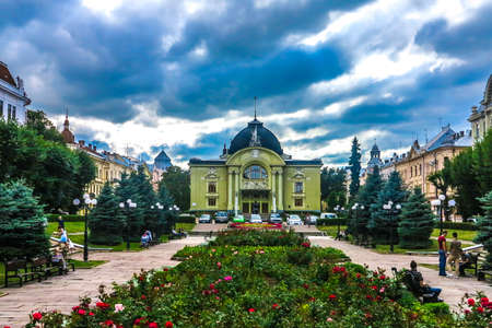 Chernivtsi Teatralna Square Music Drama Theater Frontal View with Cloudy Sky Background