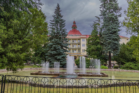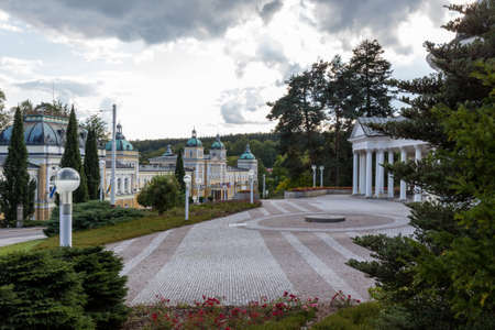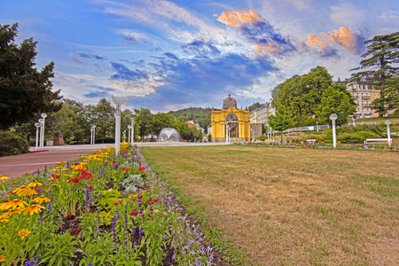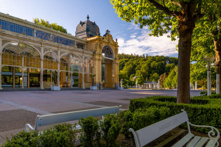 Marianske lazne, Czech Republic, 7 August 2021: Romantic architecture of Bohemia, spa city Marienbad, neo-Baroque Maxim Gorky's Colonnade with fountain, national cultural monument at sunny summer day