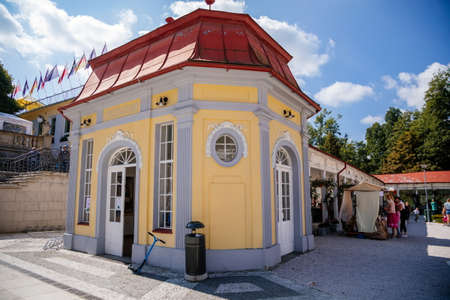 Marianske Lazne, Czech Republic - October 17, 2022: Autumn atmosphere in Czech spa Marianske Lazne (Marienbad) - building of pavilion of mineral water Cross Spring - sunny autumn d