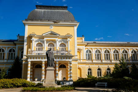 Frantiskovy Lazne, Western Bohemia, Czech Republic, 14 August 2021: Neo-Renaissance building Imperial Baths in park of great famous spa town Franzensbad, Monument to Francis Joseph I, sunny day