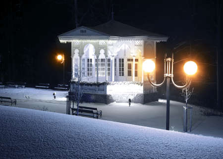 Old Art Nouveau spa pavilion at night in winter with snow and lamp in foreground HDR