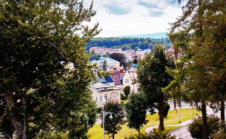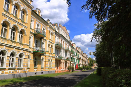 Marianske Lazne, Czech Republic - September 09, 2017: Colorful tenement houses emerge from among the greenery. Many trees give the impression that the city is located in the woodland.