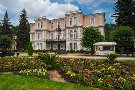 KISLOVODSK, RUSSIA - JULY 09, 2020: View of the street in Kislovodsk, a spa city in Stavropol Krai, in the North Caucasus region of Russia