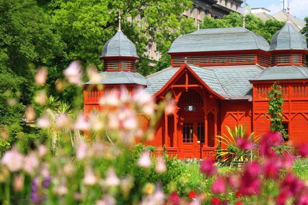 Historic red pavilion and colorful flowers in botanical garden, in Zagreb, Croatia.