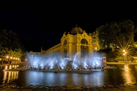 Main colonnade in the small west Bohemian spa town Marianske Lazne and singing fountain at night - Czech Republic