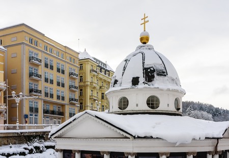 Roof on the Pavilion of The Cross Spring (krizovy pramen). Spa center of small west Bohemian spa town Marianske Lazne (Marienbad) in winter with snow - Czech Republic