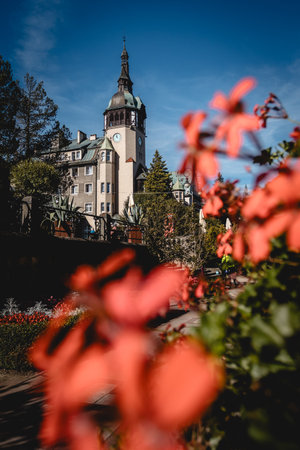 Polanica Zdroj, Poland, July 16, 2023: Hotel Sanatorium Wielka Pieniawa and park in city Polanica Zdroj in Klodzko County, Lower Silesian Voivodeship in Western Poland