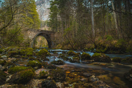 Stone bridge at the river spring of Kamniska Bistrica in Slovenia in dry winter time. Cold enchanted bridge with flowing water underneath in the middle of the forest.