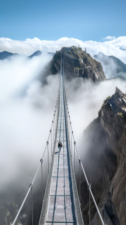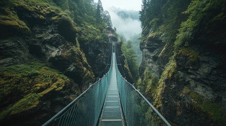 Experience the breathtaking beauty of a suspension bridge nestled in a lush mountain landscape, enveloped by mist and serene greenery, perfect for adventures and explorations.